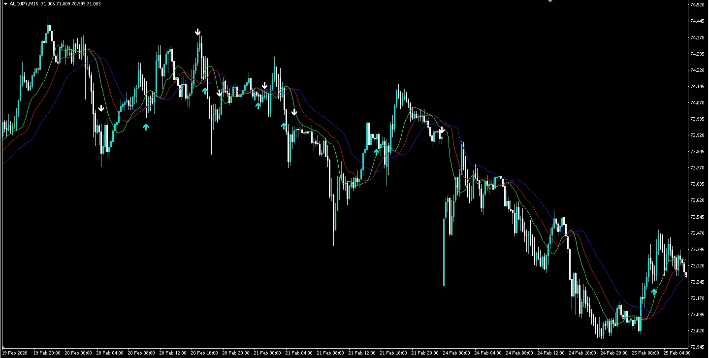 「Saikix-Alligator-Signal.ex4」は矢印型のインジケーターなので使い方は、基本矢印に従うだけです。「Saikix-Alligator-Signal.ex4」単体ではシグナルが表示されるだけで、移動平均線を表示したい場合はご自身で別途追加していただく必要があります。