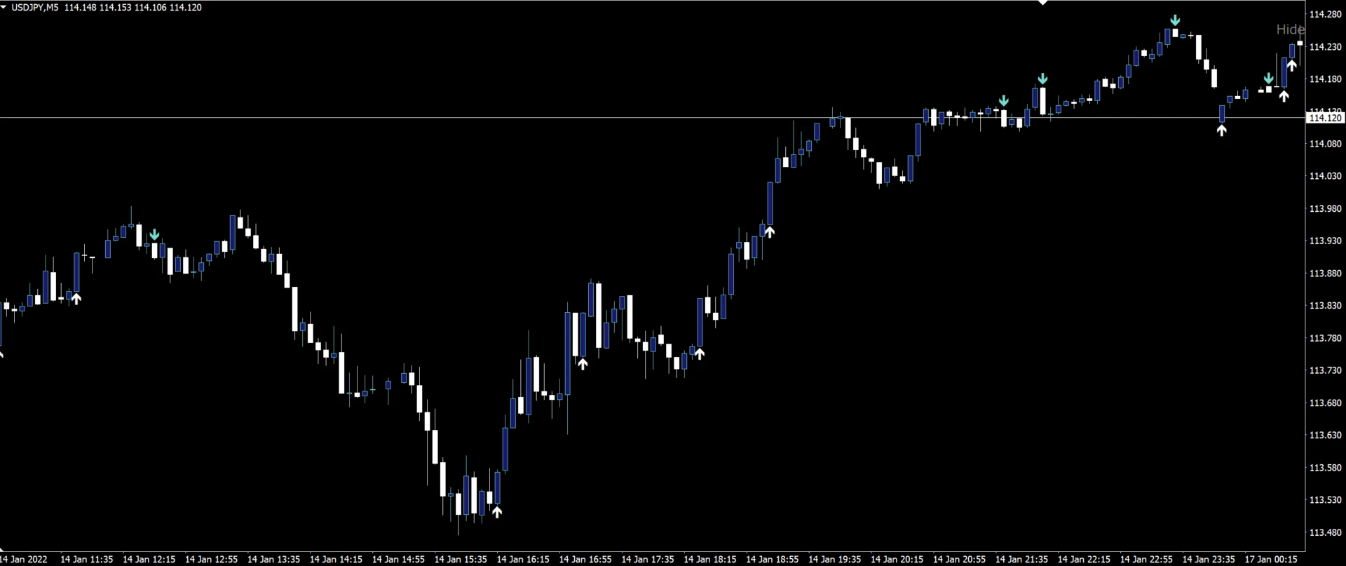 ヒゲと実体の割合シグナルツールでは、「ヒゲが実体に対して10%の時以下だけサインを出現させる」「300%以上の時だけサインを出現させる」といったように「〇〇%以下」「〇〇%以上」という形で「ヒゲと実体の割合」を自分で好きに指定して矢印を出すことができます。例えば、坊主、大陽線、ピンバー、十字線など強いプライスアクションの発生で矢印を出現させ、アラートを鳴らすことができます。