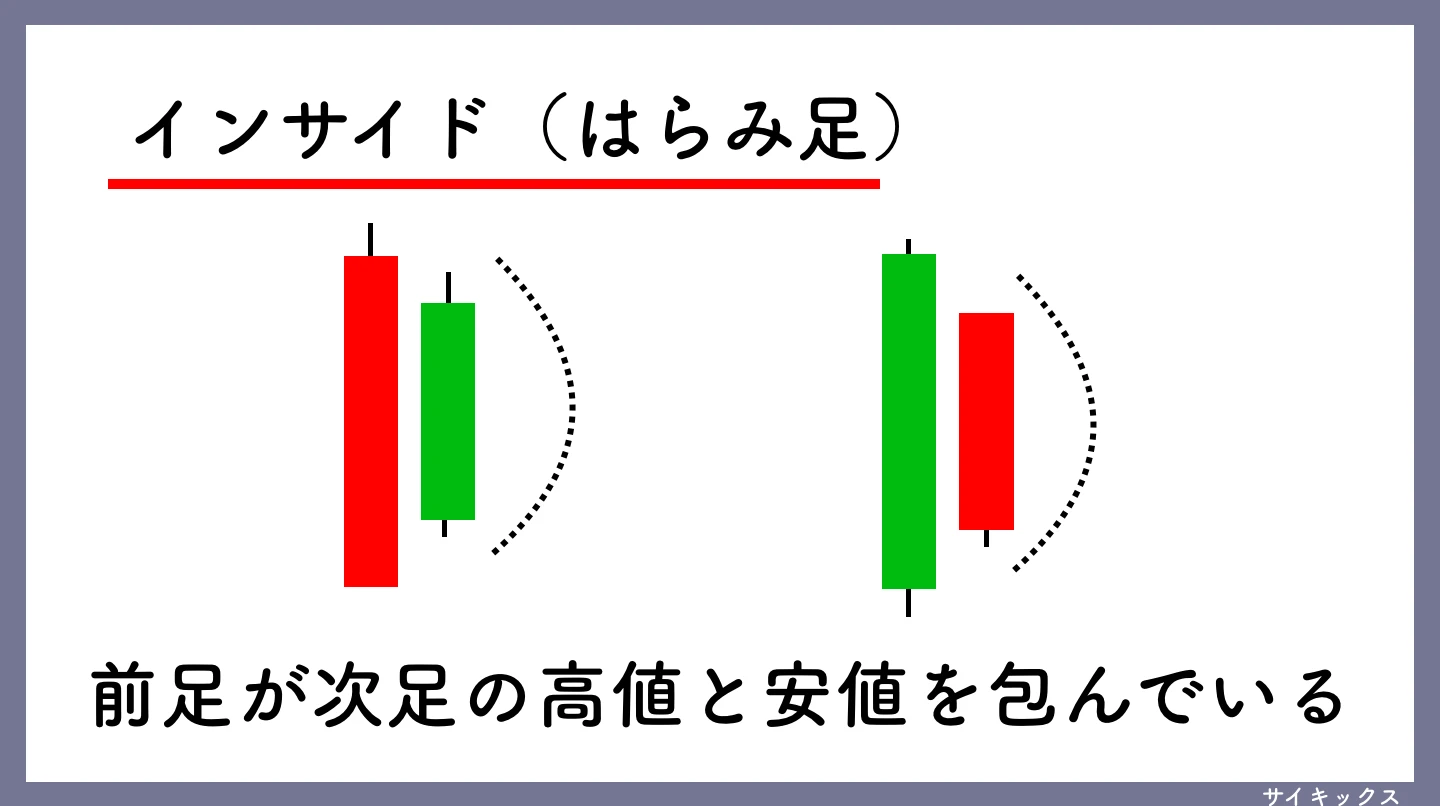孕み足(はらみあし)とは...前足が次足の高値安値を包んでいるローソク足のパターンのこと、海外だとインサイドバーとも呼ばれる。