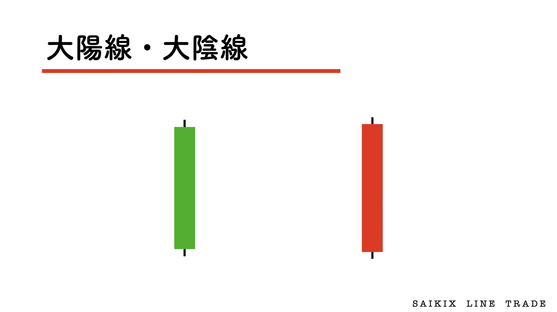 大陽線、大陰線とは...始値から終値まで一方方向で伸びかつ、直近チャートの過去20本ローソク足の平均サイズpipと比べて1.3倍以上あるローソク足パターンのこと。