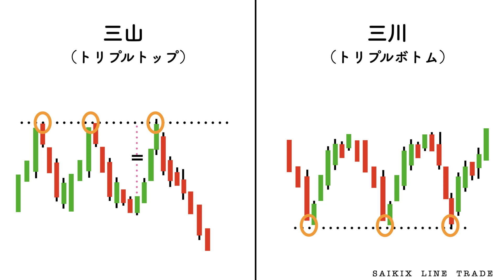 三川とは...同じ価格帯で3回底値をつけているローソク足のパターンのこと、トリプルボトム、3番底、トリプル底とも呼ばれる。