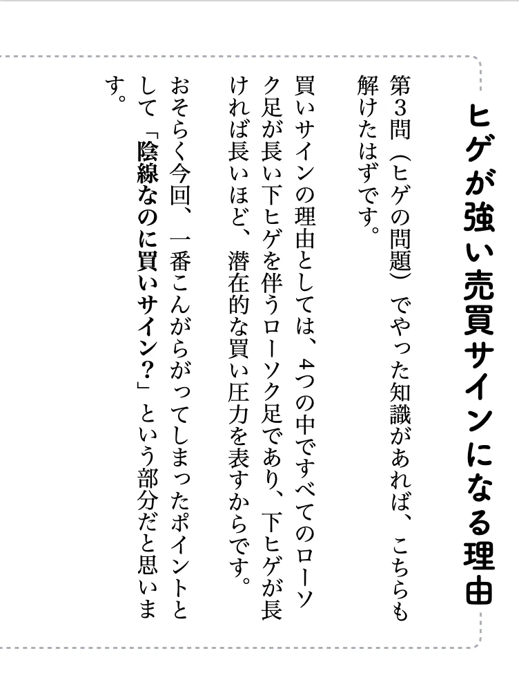 大陽線、大陰線というと一番ローソク足の中でシンプルすぎるが故に、見逃されがちなローソク足ですが、チャートの中で見るべきポイントというのは「大きい圧力がはたらいた箇所」「激しい攻防が行われている箇所」であり、大陽線、大陰線は「短期間で大きく圧力がかかったこと」を端的に示します。大陽線の発生で「上昇トレンド時にまだまだ買い意欲がある」というトレンドの余地を判断することができます。