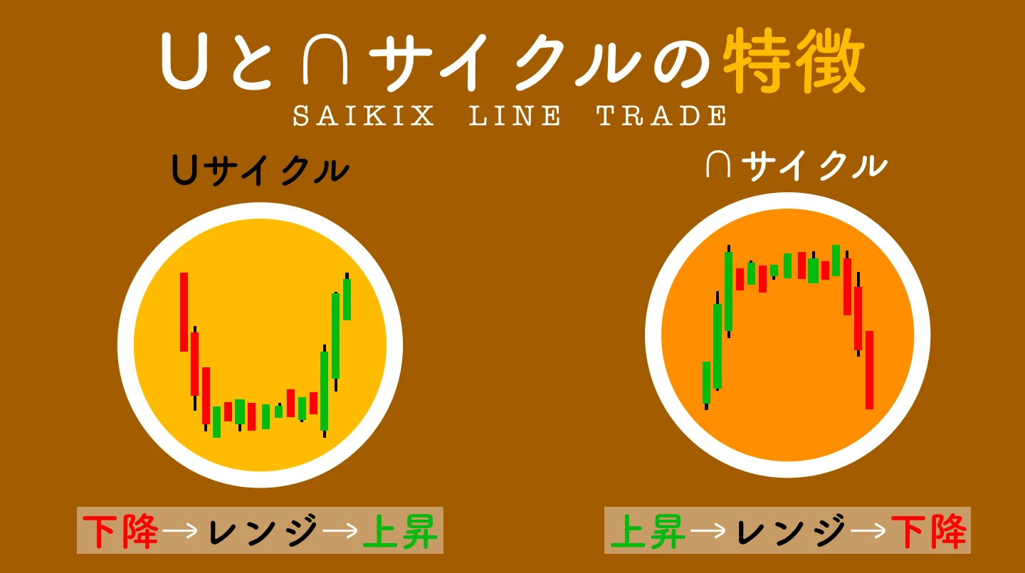 Uは「急落→レンジ→急騰」/ ∩サイクルは「急騰→レンジ→急落」を経て形成されたチャートの形になります。