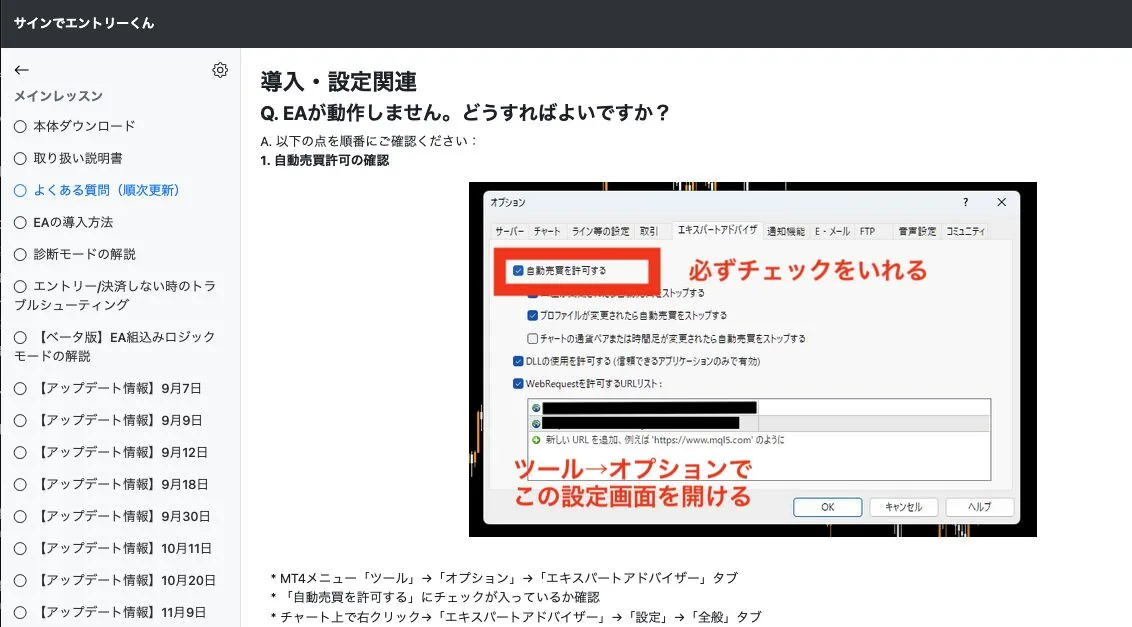 トラブルシューティング集やEAをこれまで使ったことない方へ向けての注意点など会員サイトのコンテンツを充実させました。 - エントリー/利確/損切りでサイン分けを実施