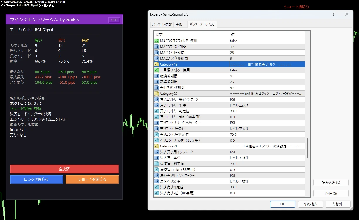 - 手動での決済ボタンの追加…EAのパネルをパネルに設置されたボタンを押すだけで手動で決済ができる機能を追加しました。「全決済ボタン」「買いロングを閉じるボタン」「ショートを閉じるボタン」の3つを用意しています。このボタンで閉じられるポジションというのはあくまでEAによってサインエントリーによってエントリーしたポジションのみとなり、手動でエントリーしたポジションはボタンを押しても決済されることはありません。