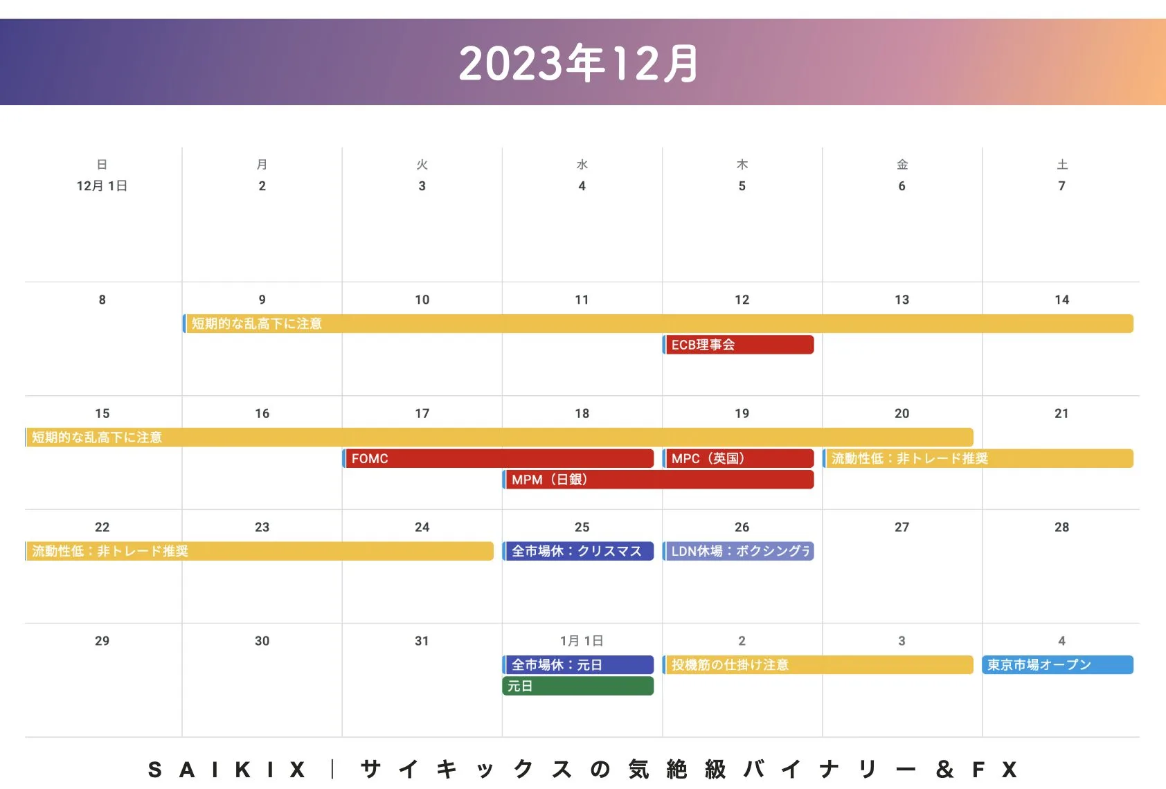 クリスマス休暇期間であることから、1ヶ月を通して新規大型ポジションは作られづらく流動性が低くなりがち。12月中旬以降は、ノルマ未達で、休暇に入れなかった投機筋の機関投資家がトレードを行うため、投機筋らしいガチャガチャトレードが多く見られ、急騰急落が起こりやすい。12月26日からは休暇明けで大きく流れが変わることも。