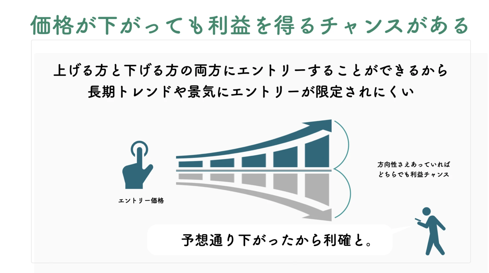 | 売り買い両方可能 | 価格が上がる方にも下がる方にも両方ポジションを持つことができる |