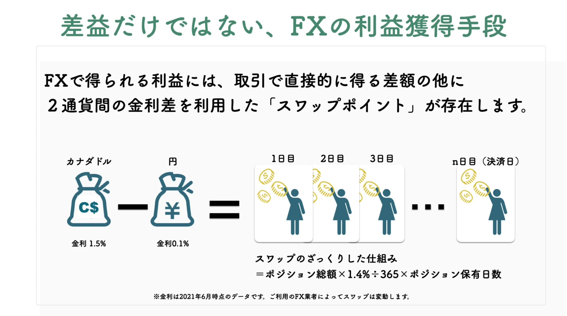 例えばカナダドルは金利が1.5%で円金利は0.1%です。この差額の1.4%分を365日で割って、ポジションを保有し続けた日数分金利の高い方の通貨を買うとスワップを受け取れることができます。