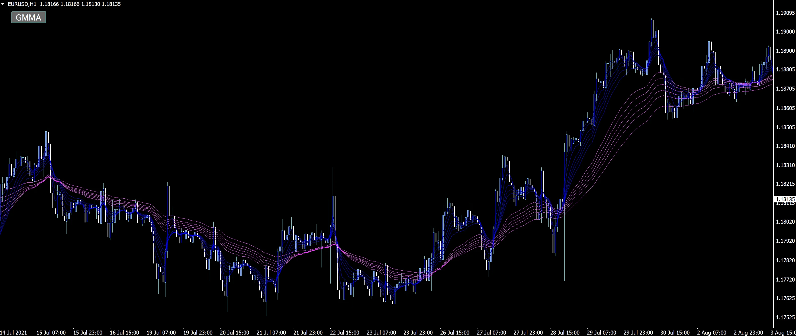 GMMAを表示させたいときだけ表示し、ライントレードで水平線を引くとき、ローソク足パターンの見極めをしたい時などGMMAが邪魔なときには非表示にすることができます。またマルチタイムフレームにも対応しているので1時間足に4時間足のGMMAを表示させることや1時間足に15分足のGMMAを表示させることも可能です。