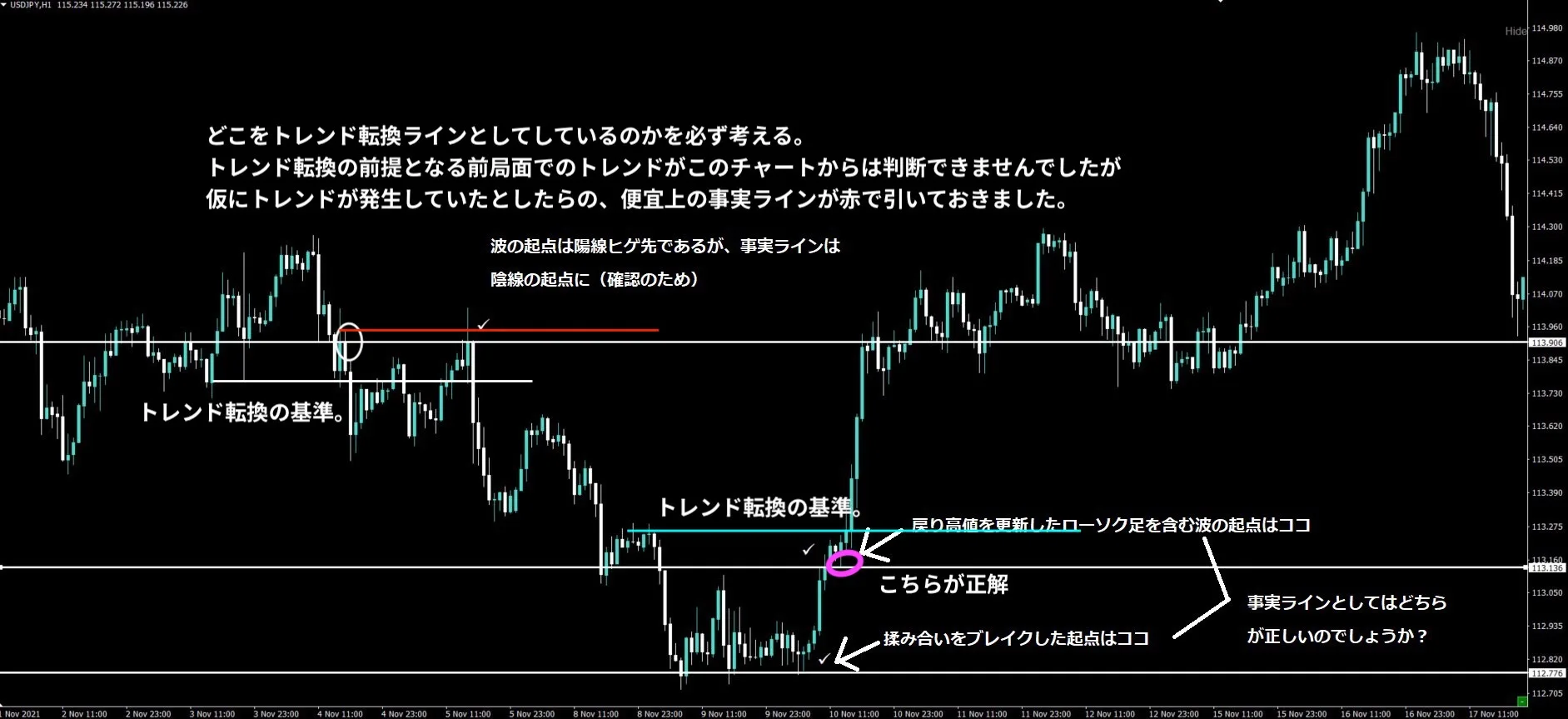(例えば、新規の売りに対して引いた事実ラインで、その事実ラインまで戻ってきてライン付近で揉み合って再度下げた場合、明確にブレイクされたとは判断しない)