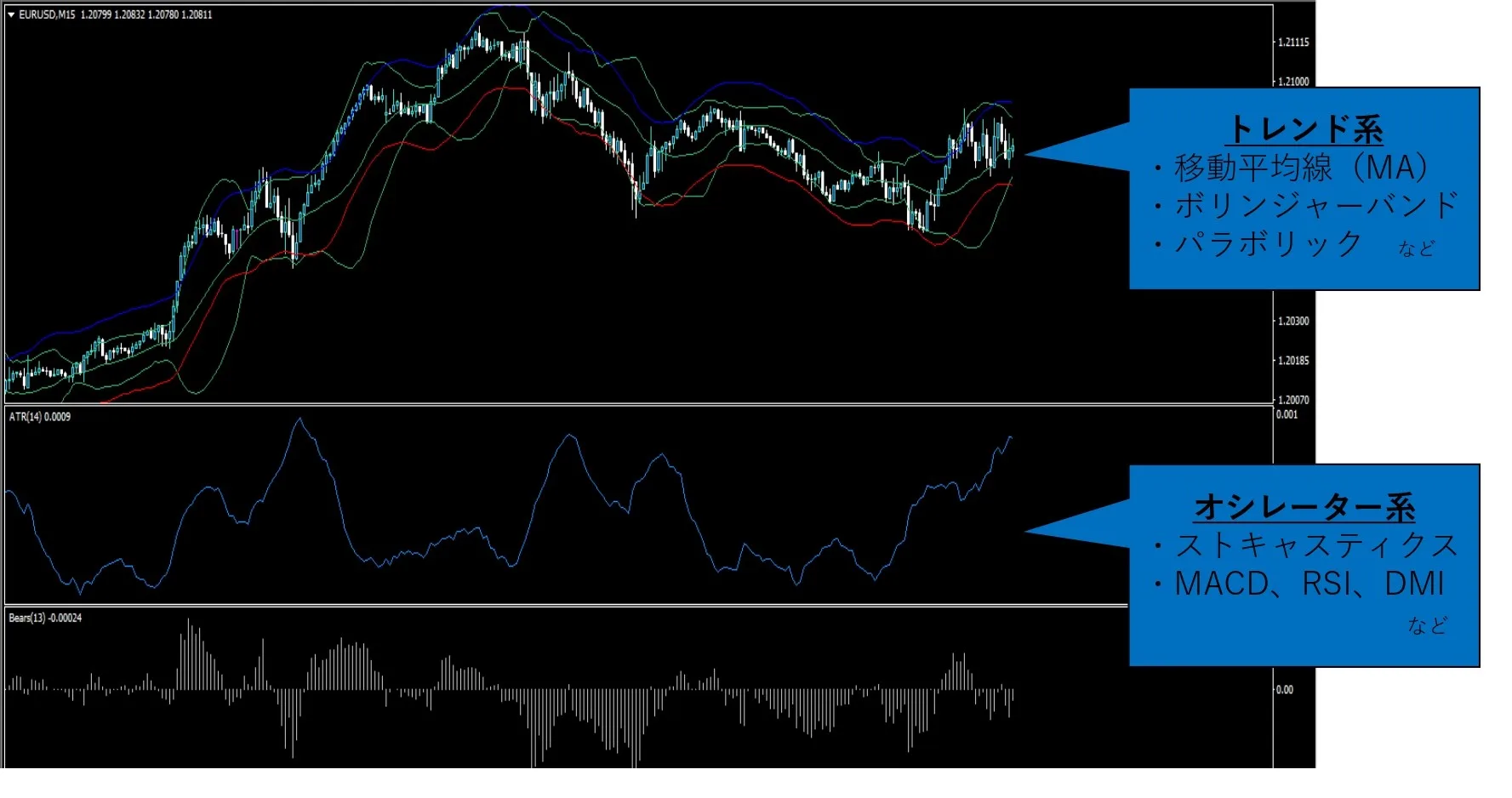 例として、移動平均線(MA)やボリンジャーバンド、バラボリックが挙げられます。
