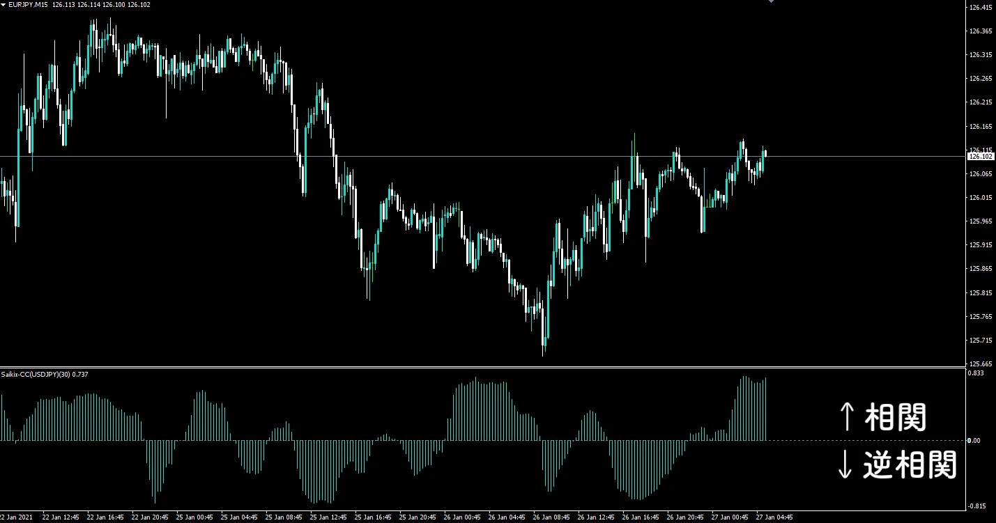 相関指数とは、通貨相関性、すなわち「2つの通貨ペアがどれだけ似たような値動きをつけたか」を測るテクニカル指標です。一見すると、相関指数とストキャスティクスにはなんの共通点もないように映るかもしれませんが、この2つには「相場の規則性」を測るインジケーターという部分で共通しています。相関係数を使ったトレードでは「基本的に相関性が高い通貨ペア同士なのにも関わらず、相関関係が外れたときを狙ってエントリー」(例:通常であればドル円とユーロ円は相関性が強くドル円もあがれば、ユーロ円もあがるが、ドル円とユーロ円が逆行した状況)といった手法があります。規則性が外れた相場というのは、レンジブレイク、トレンド転換の予兆サインになることが多いため、単一通貨ペアの規則性を測るストキャスと、2通貨ペアの規則性を測る相関係数を合わせて使うことで優位にトレードを行うことができます。