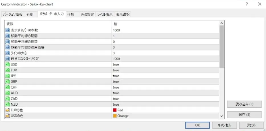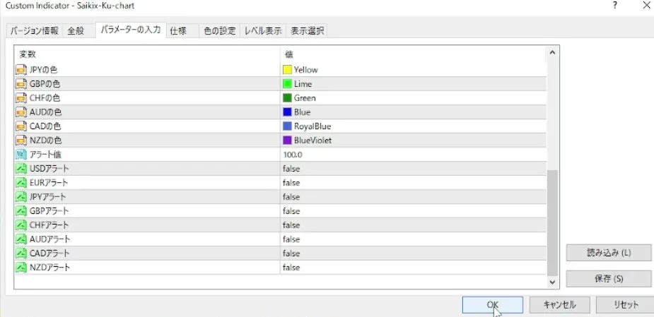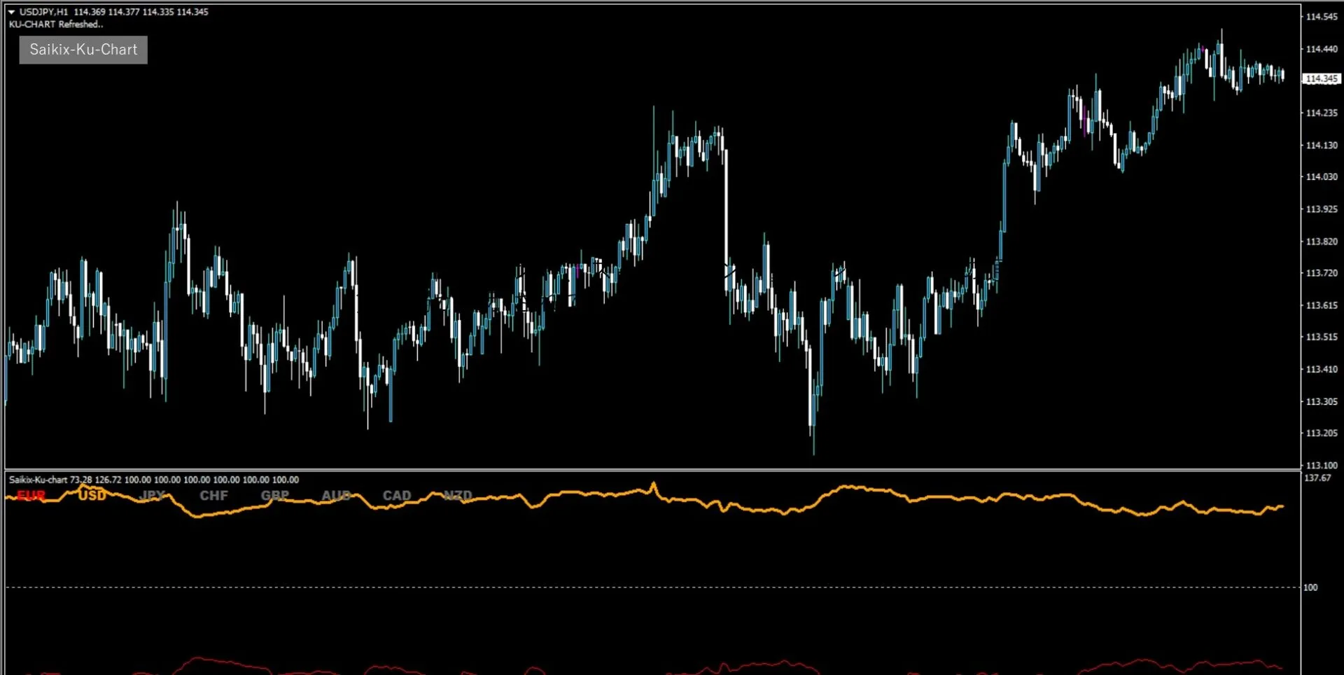 Ku-Chart(クーチャート)自体は、2000年初期からあった有名なインジケーターで、相場環境認識を行う時の強力な武器として、プロのトレーダーにも使われてきました。「Saikix-Ku-Chart.ex4」は既存のクーチャートを完全日本語化し、2022年用に使い勝手を向上、指定の通貨ペアがチャンスになったら通知がくるようアラートを設定したインジケーターです。