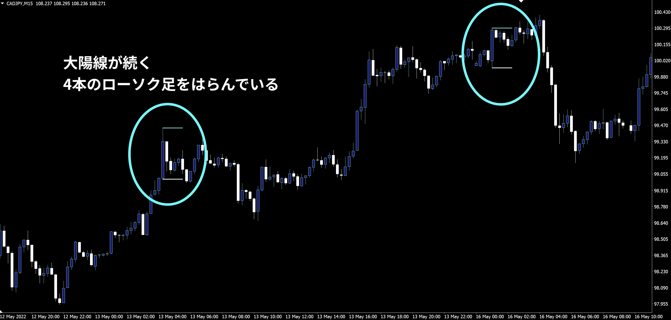 マスターキャンドルとは…1本の長いローソク足の中に続く4本のローソク足がはらんでいるローソク足パターン(プライスアクション)のこと。酒田五法”はらみあし”の上位互換で、海外だとインサイドと呼ばれることもある。