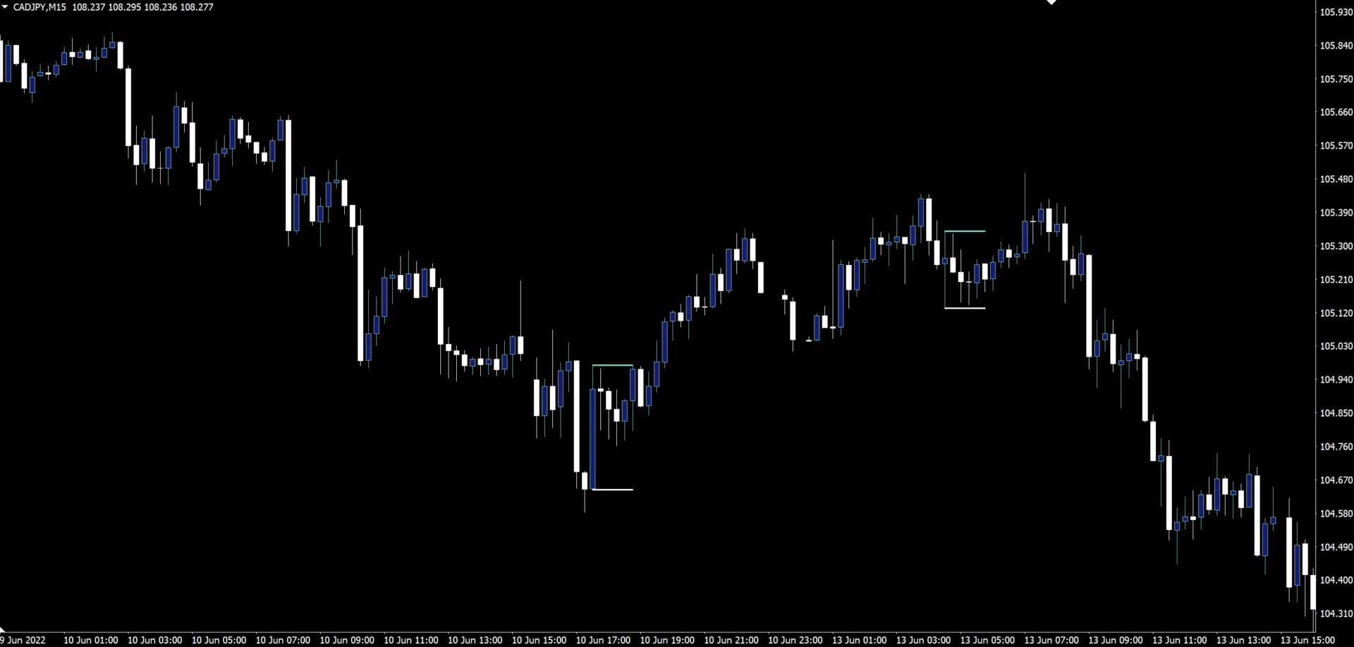 インジケーターを導入するだけで、マスターキャンドルを自動検出し、高値と安値にラインが自動で引かれます。タイミングでもたついている局面や短期トレンド転換が起きる場面でマスターキャンドルが多く出ていることがわかります。