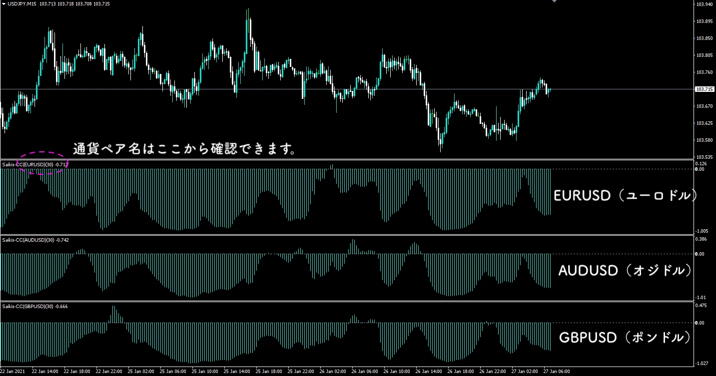 相関係数インジケーターをいれることで、1分単位、15分単位、1時間単位など、ご自身のトレードの時間軸にあわせて通貨ペアの相関関係を数値として見ることができます。
