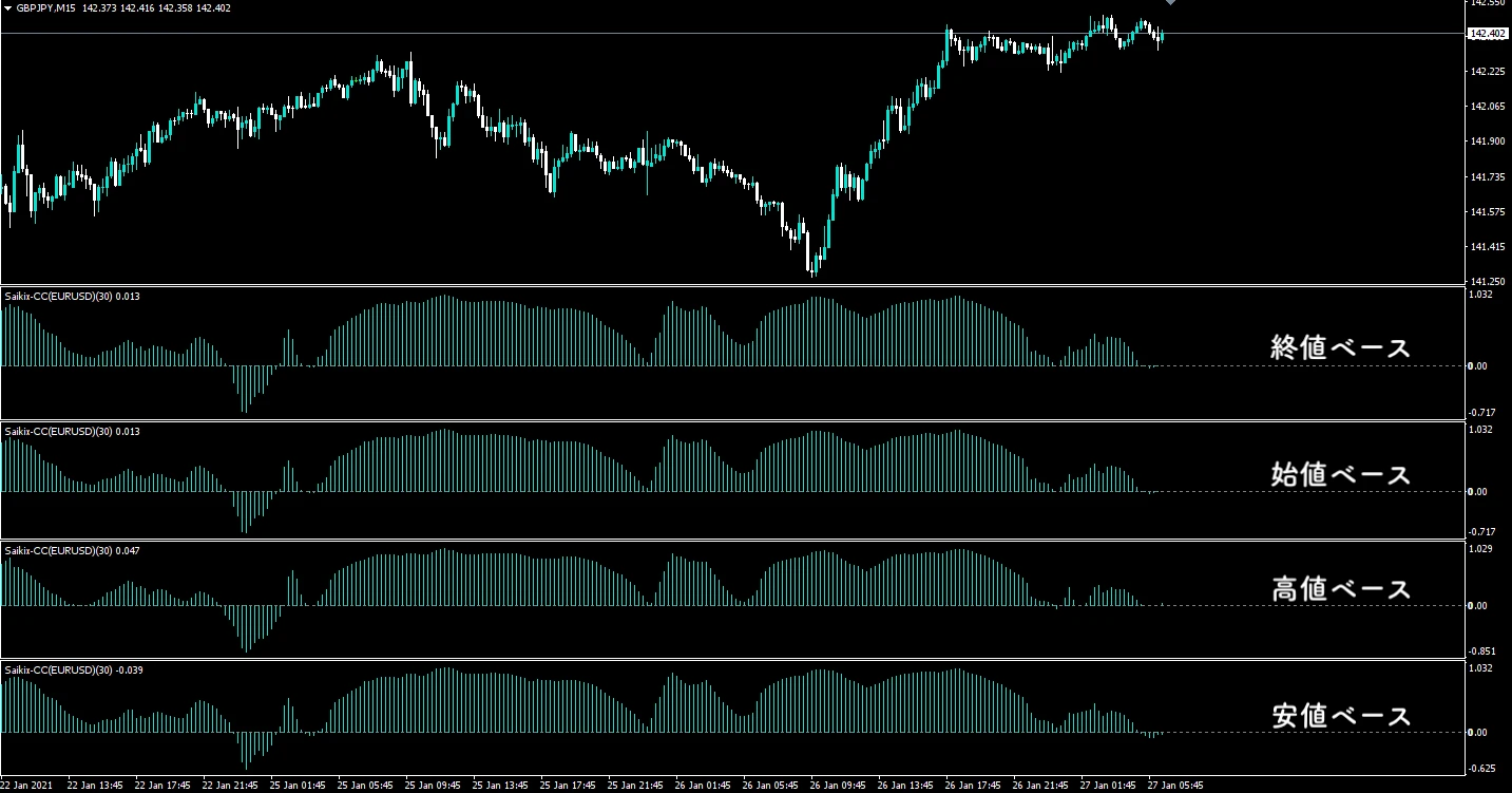 相関関数を算出する足を「高値」「安値」「終値」「始値」の4つの中からどの足ベースで算出するかを選ぶことができます。特にこだわりがない場合は初期設定の「終値」で問題ありません。