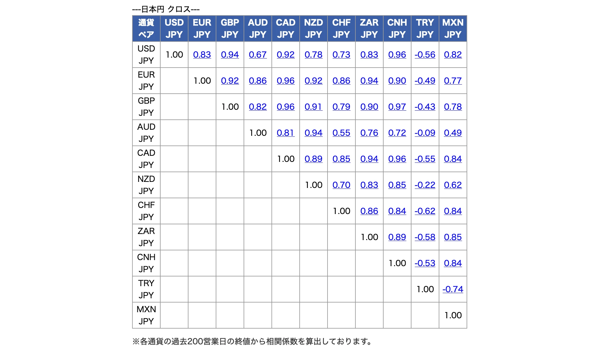 相関係数といってもどの通貨ペア同士の通貨相関性をみれば良いのかが、最初はわからないと思います。過去200日分の相関係数をわかりやすくまとめてくれているサイトがあるので、相関係数が強い通貨ペアの組み合わせを探して参考にしましょう。