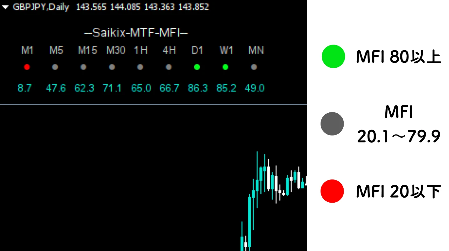 それぞれの時間足でマネーフローインデックスが80以上になると緑に点灯し、20以下になると赤に点灯することで「買われすぎ売られすぎ」をひとめで把握できるようになっています。
