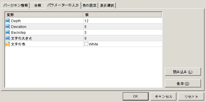 基本的なZigZagのパラメーターはご自身で設定していただくことが可能です。初期設定は、一番ベーシックなDepth「12」Deviation「5」Backstep「3」になっています。