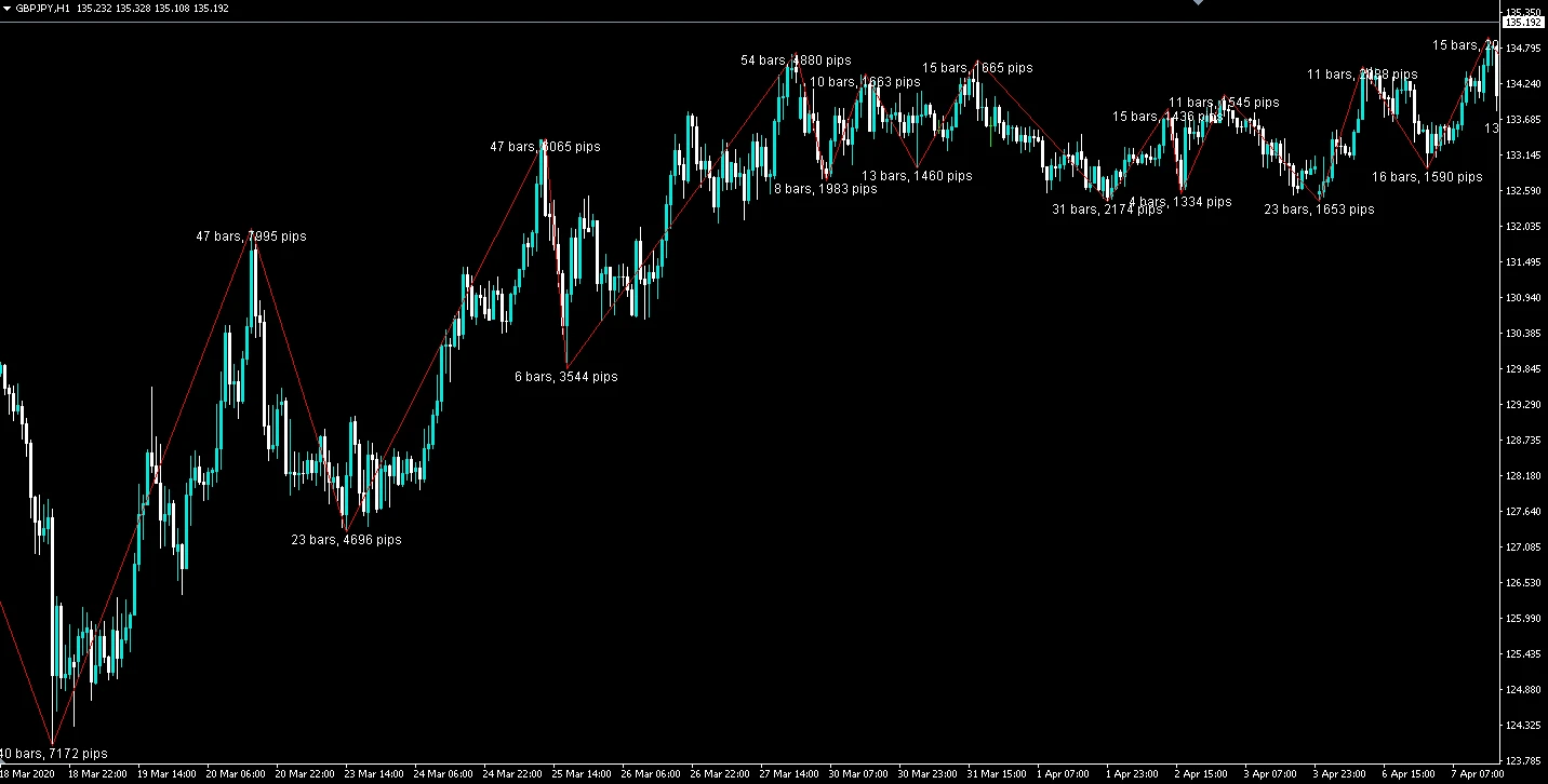 自分で前回高値と前回安値を見つける際にどこかを1発でわかることに加えて、前回安値から前回高値までのひとつの波が何pipsで、ローソク足何本かけて作られたのかというのを見ることができます。