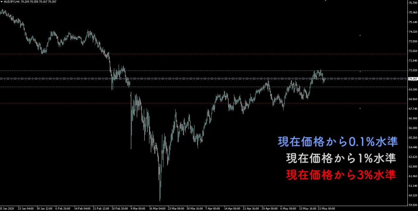 パラメーターの入力の「値幅1〜値幅3」の数字を変更することでラインを引く値幅を自由に変えることができます。初期設定では0.1%水準、1%水準、3%水準となっていますが、10%水準、20%水準などの大きな値幅も設定することができます。