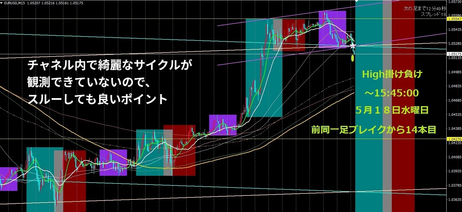 Benefit Duo1ex4では、主に前々回高値から前回高値の角度、前々回安値から前々回安値の角度とサイクル、ローソク足、ボラティリティ、定義付けをして、チャネルトレンド相場を検出し、順張りの逆張りに適しているポイントをラインとして描画したしています。