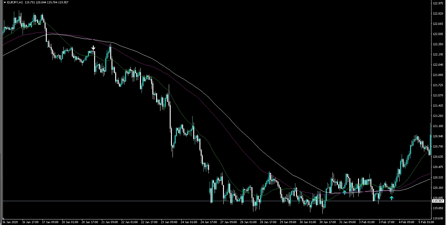 「Saikix-MA-Signal.ex4」単体ではシグナルが表示されるだけで、移動平均線を表示したい場合はご自身で別途追加していただく必要があります。