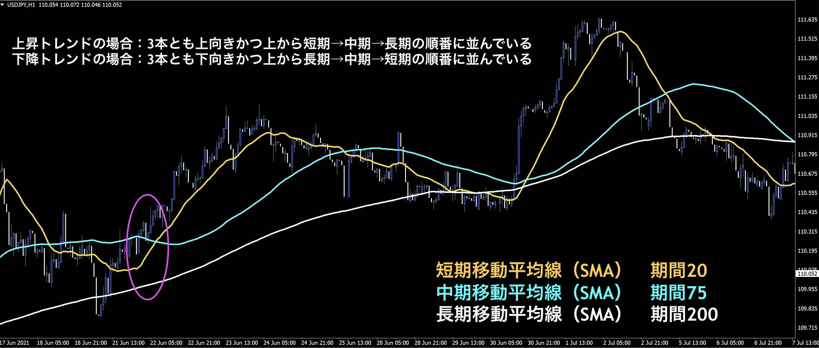 パーフェクトオーダー(Perfect Order)とは、短期、中期、長期の3本のそれぞれ期間の異なる移動平均線を設定し、「短期・中期・長期の移動平均線」が全てトレンドの方向に並んでいる状態を指します。