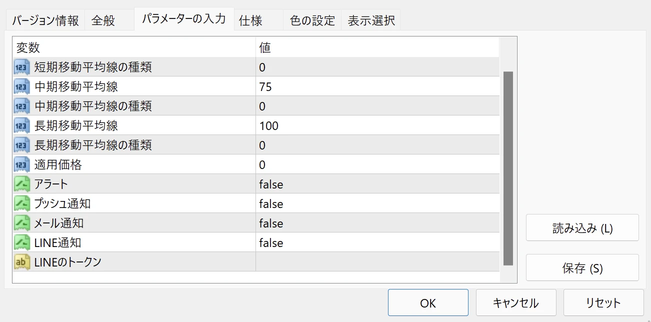 サインを出現させる移動平均線の期間及び種類を自由に選ぶことができます。初期値ではベーシックな短期MA「25」中期MA「75」長期MA「200」にしています。