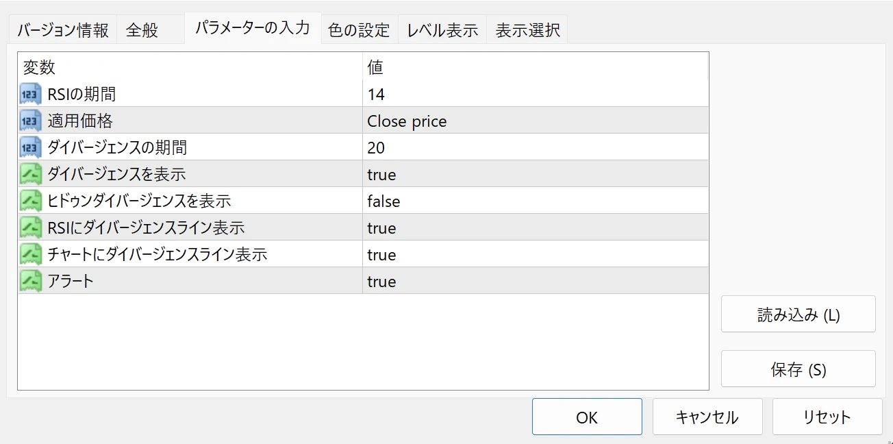 ダイバージェンス表示インジケーターの各種パラメーター