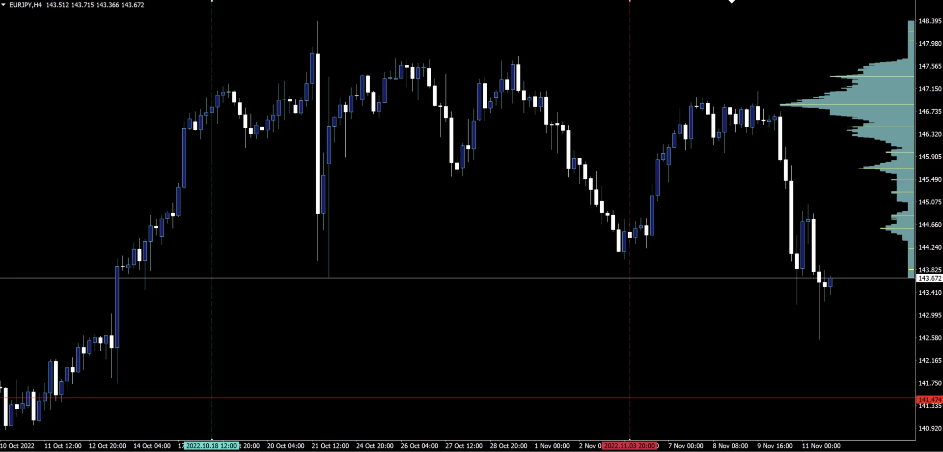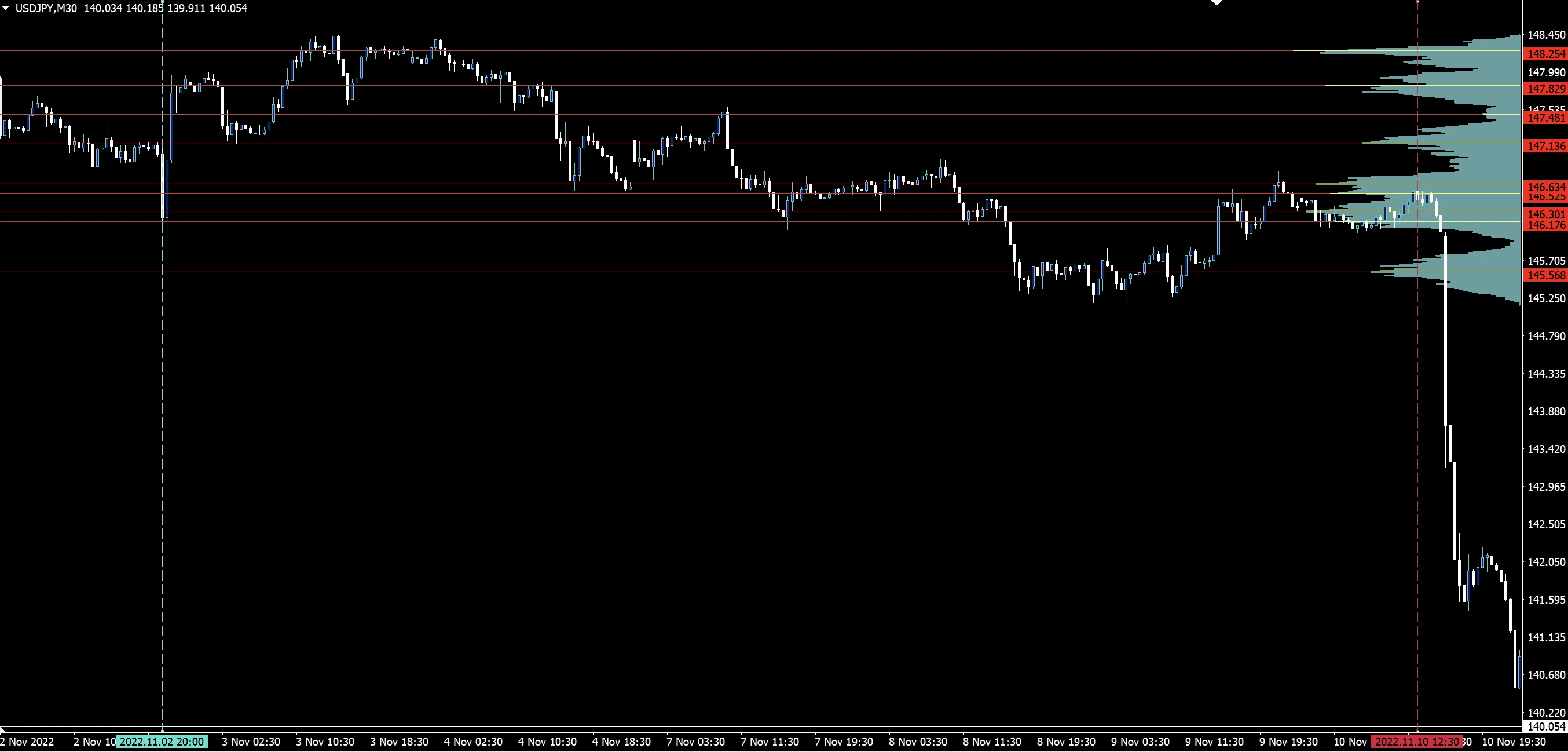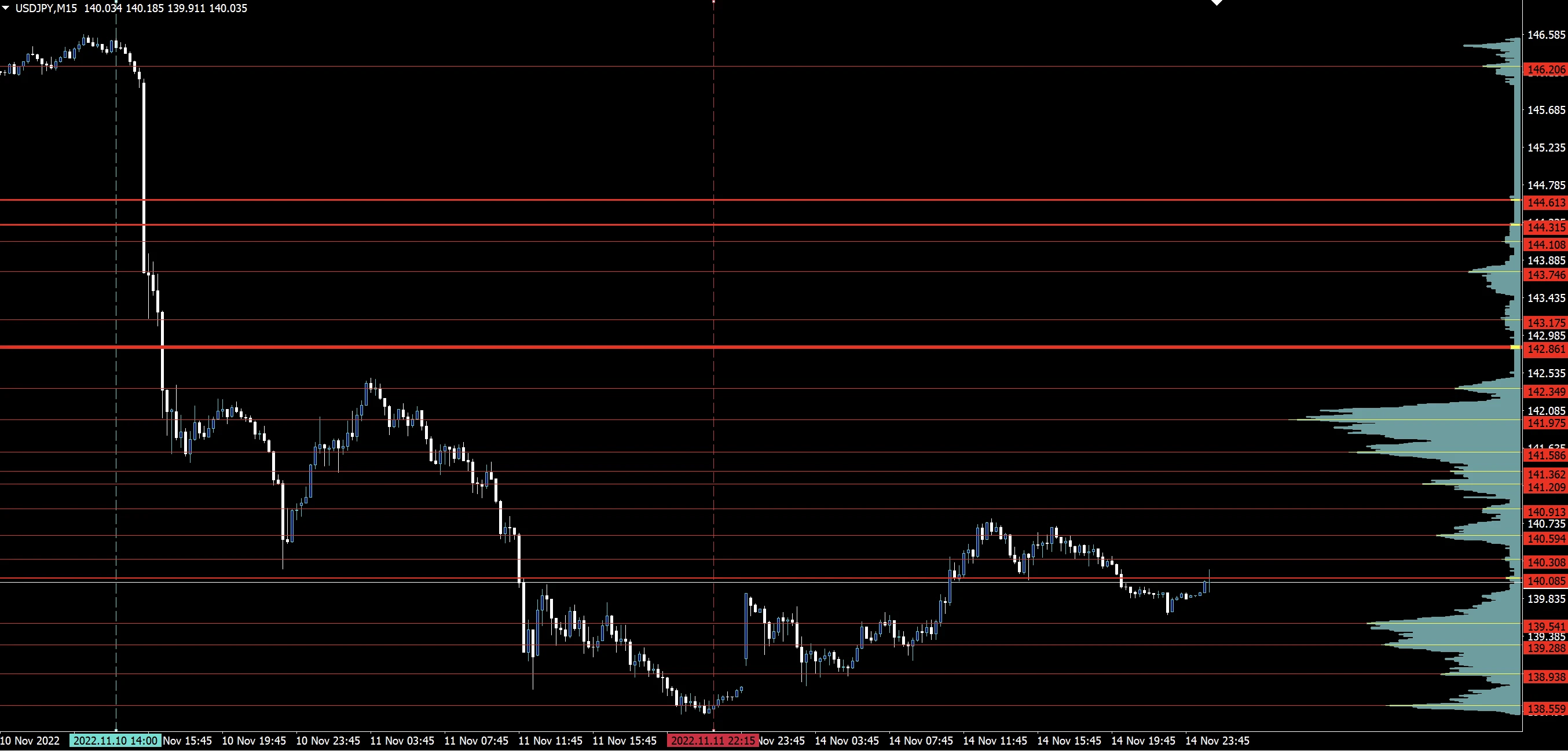 水色の垂直線を起点、赤い垂直線を終点として価格帯別出来高を算出します。ラインを動かすだけだけで価格帯別出来高を算出する期間を設定できるため、「N字だけ」「ボックスレンジだけ」「ダブルトップだけ」といったように自由度高く見たい場面だけ価格帯別出来高を算出することができます。