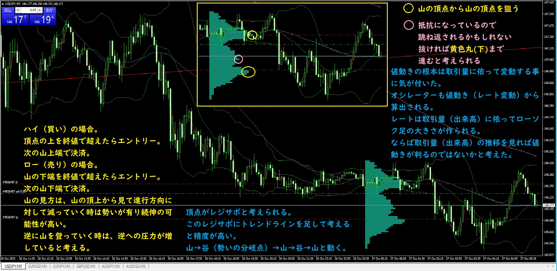 具体的には「エリオット波動で第2波から第3波に移行する時のダマシ」「レンジブレイクした時にフェイクブレイクではないか」「レジスタンスライン、サポートラインが信頼できるものなのか」を判断する時に、価格帯別出来高のボリュームで判断することができます。