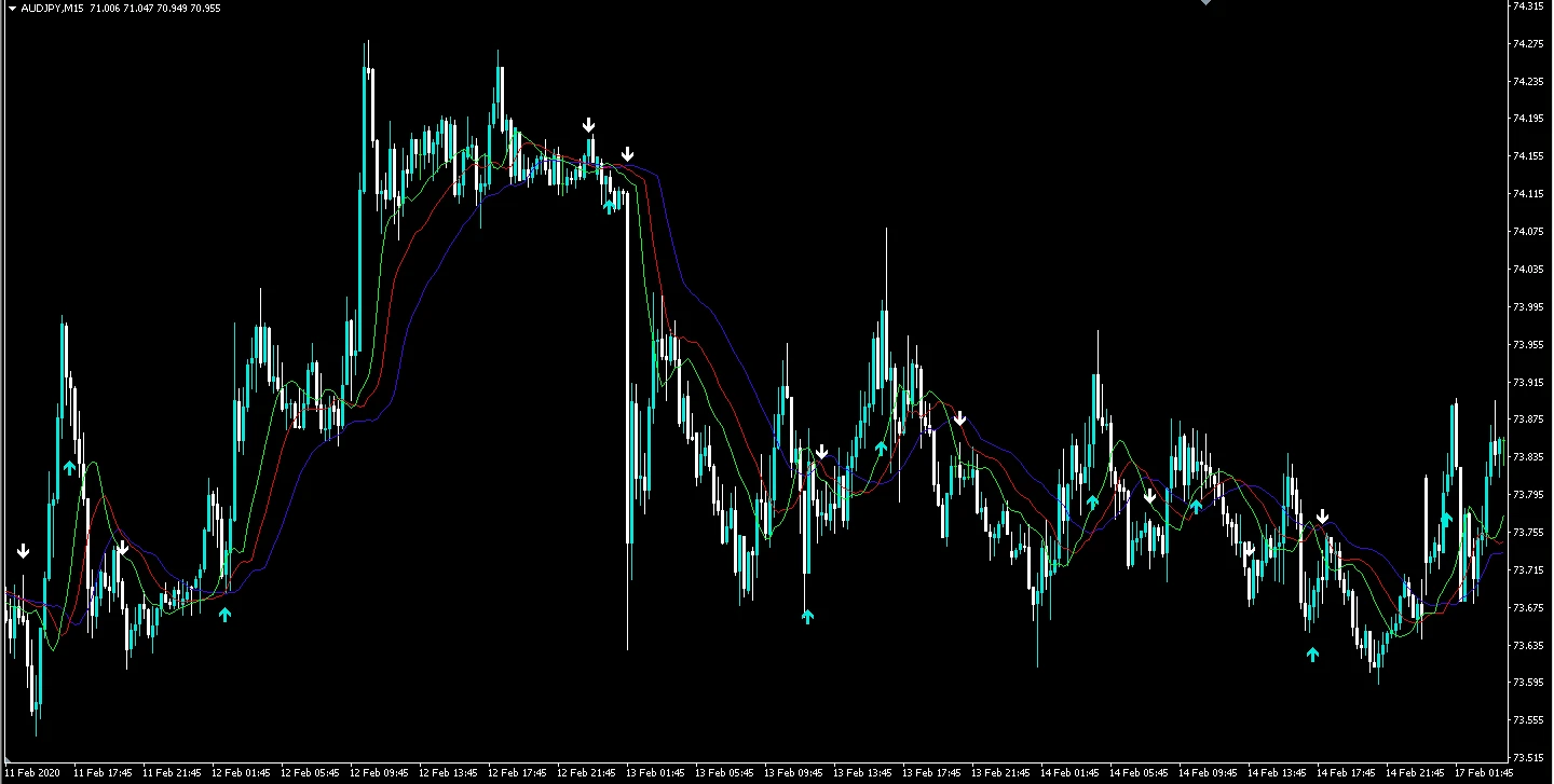 「Saikix-Alligator-Signal.ex4」は矢印型のインジケーターなので使い方は、基本矢印に従うだけです。「Saikix-Alligator-Signal.ex4」単体ではシグナルが表示されるだけで、移動平均線を表示したい場合はご自身で別途追加していただく必要があります。