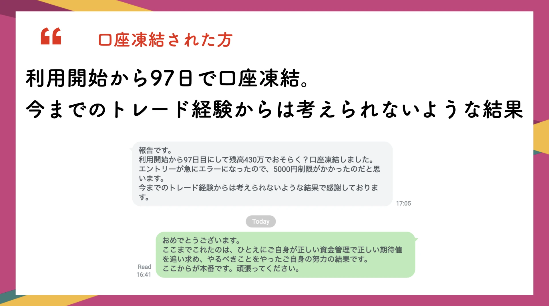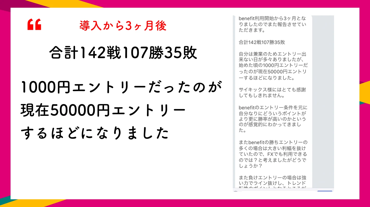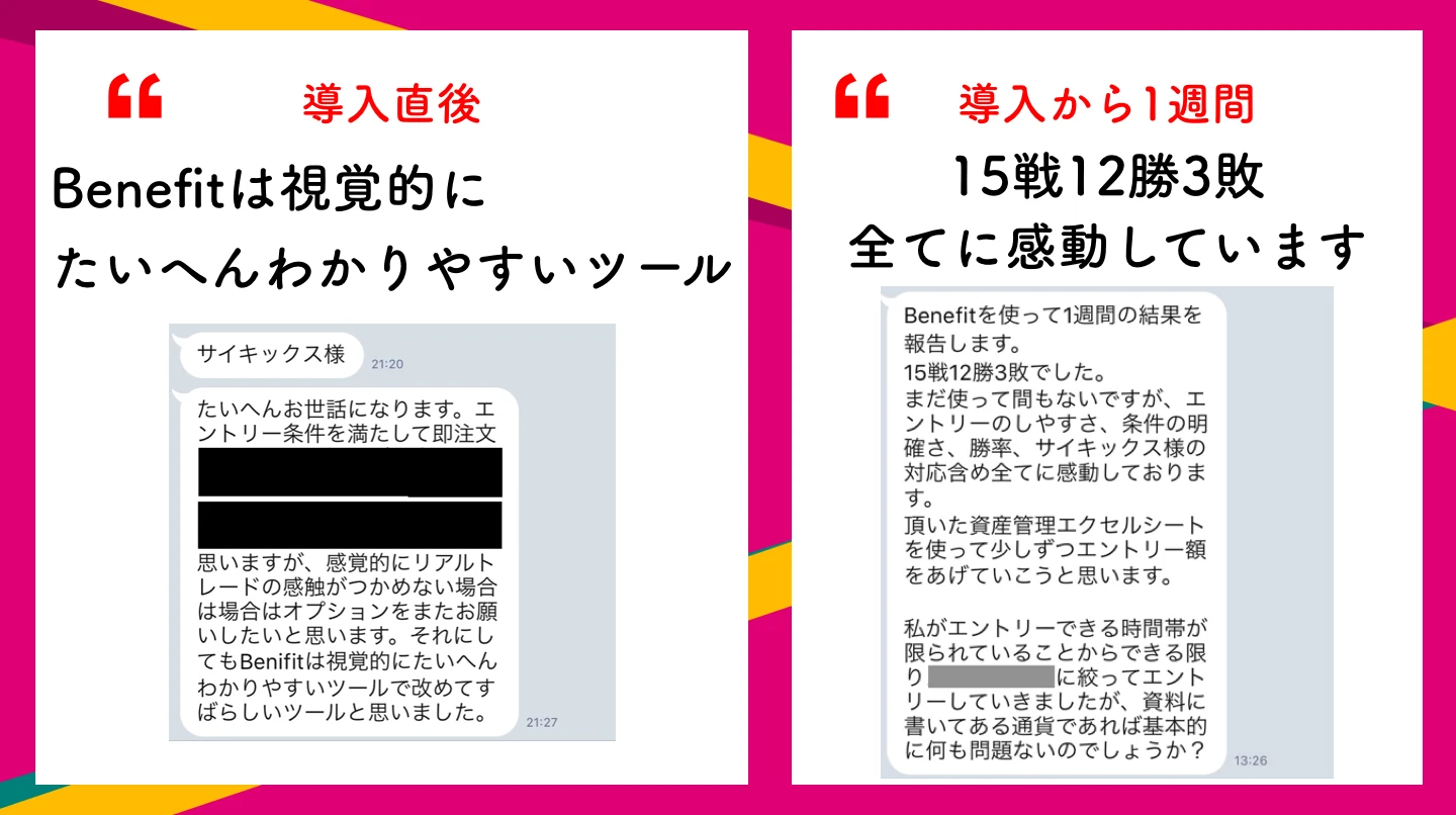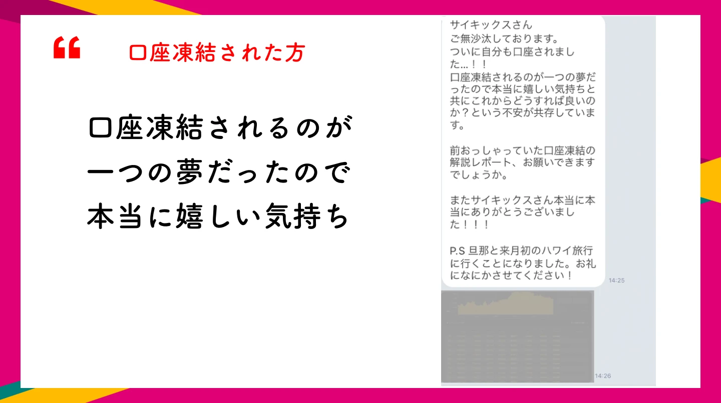 有難いことに、単純に勝率結果の報告に加えて「凍結されました」「斉木さんのおかげで子供の学費を払えました」「人生変わりました」といったようなLINEが毎日のように届きます。