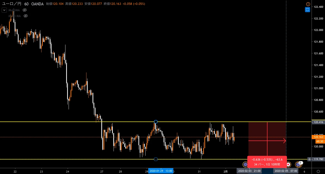 上記は直近のEUR/JPYですが1時間足のボックスレンジの幅がわずか63.6pipsしかありません。