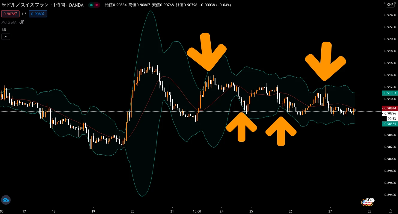ボリンジャーバンド が停滞している時は、バンド幅によって取るべき行動が変化します。