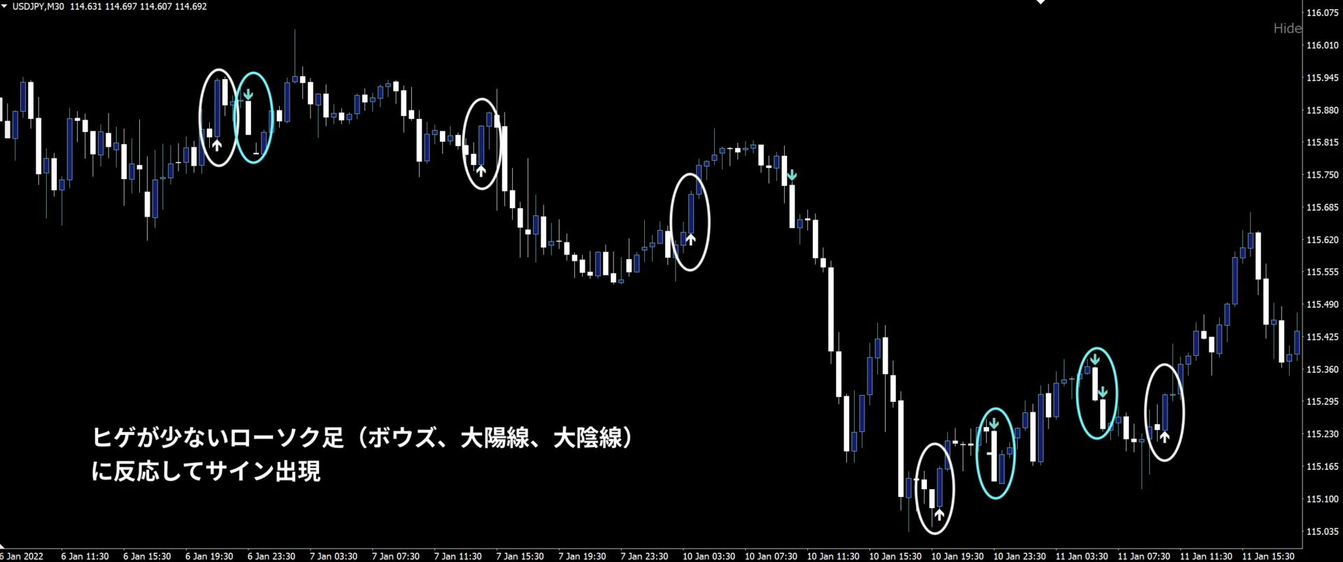 ヒゲの割合が10%以下で矢印シグナルが表示されるように設定しています。このパラメーターですと、坊主など実体の割合が高く一般的に強いトレンド継続サインだと言われているローソク足パターンを見ることができます。