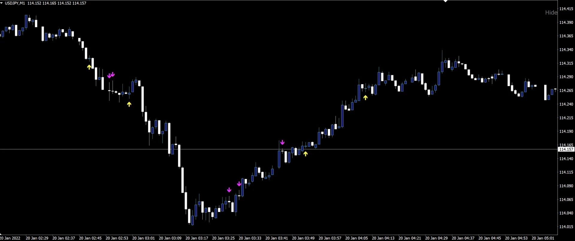 ヒゲと実体の割合シグナルツールでは、「ヒゲが実体に対して10%の時以下だけサインを出現させる」「300%以上の時だけサインを出現させる」といったように「〇〇%以下」「〇〇%以上」という形で「ヒゲと実体の割合」を自分で好きに指定して矢印を出すことができます。例えば、坊主、大陽線、ピンバー、十字線など強いプライスアクションの発生で矢印を出現させ、アラートを鳴らすことができます。
