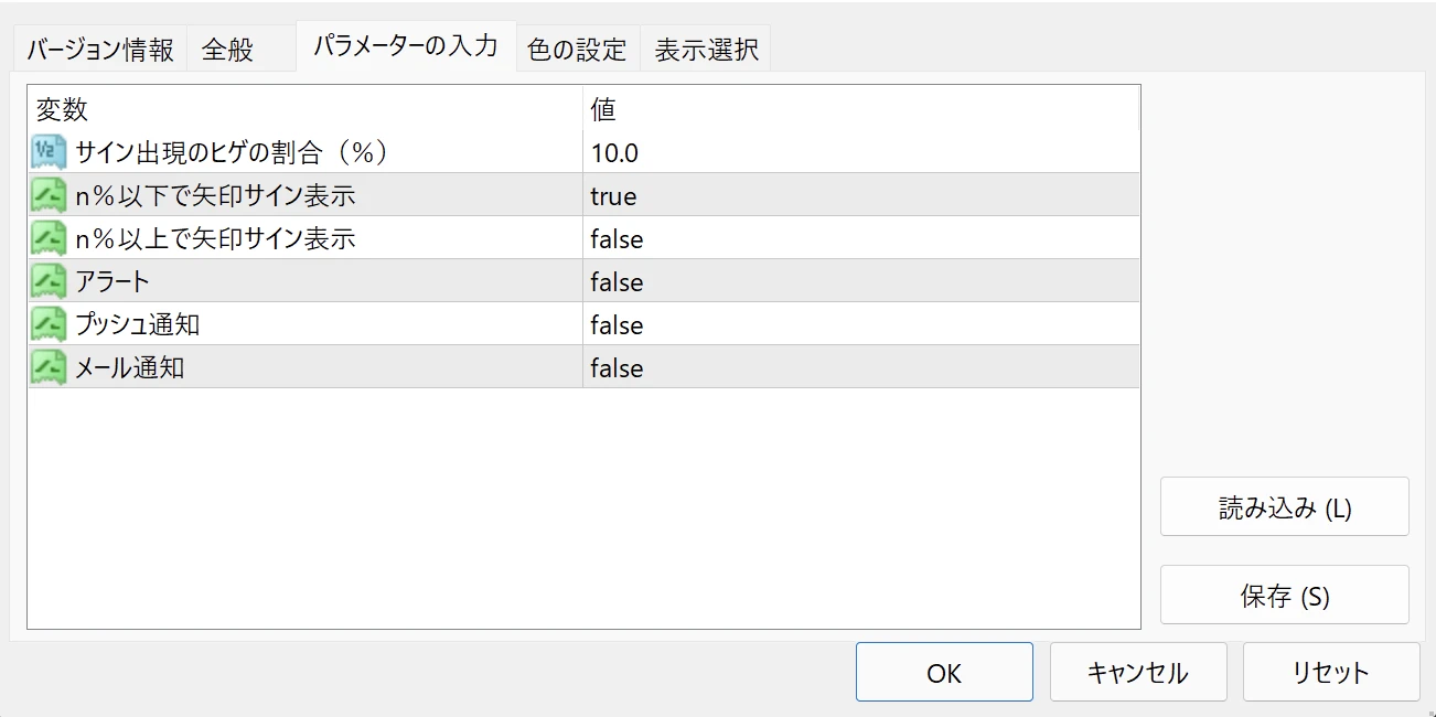 - n%以上で矢印サイン表示...trueにすると指定した数値よりヒゲの割合が高ければサイン出現させる