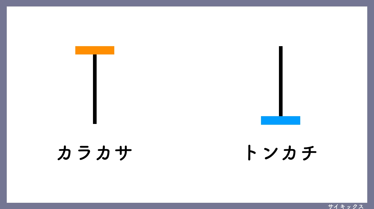 カラカサとは...実体が短くて、長い下ヒゲを持つローソク足のパターンのこと、ピンバーとも呼ばれる