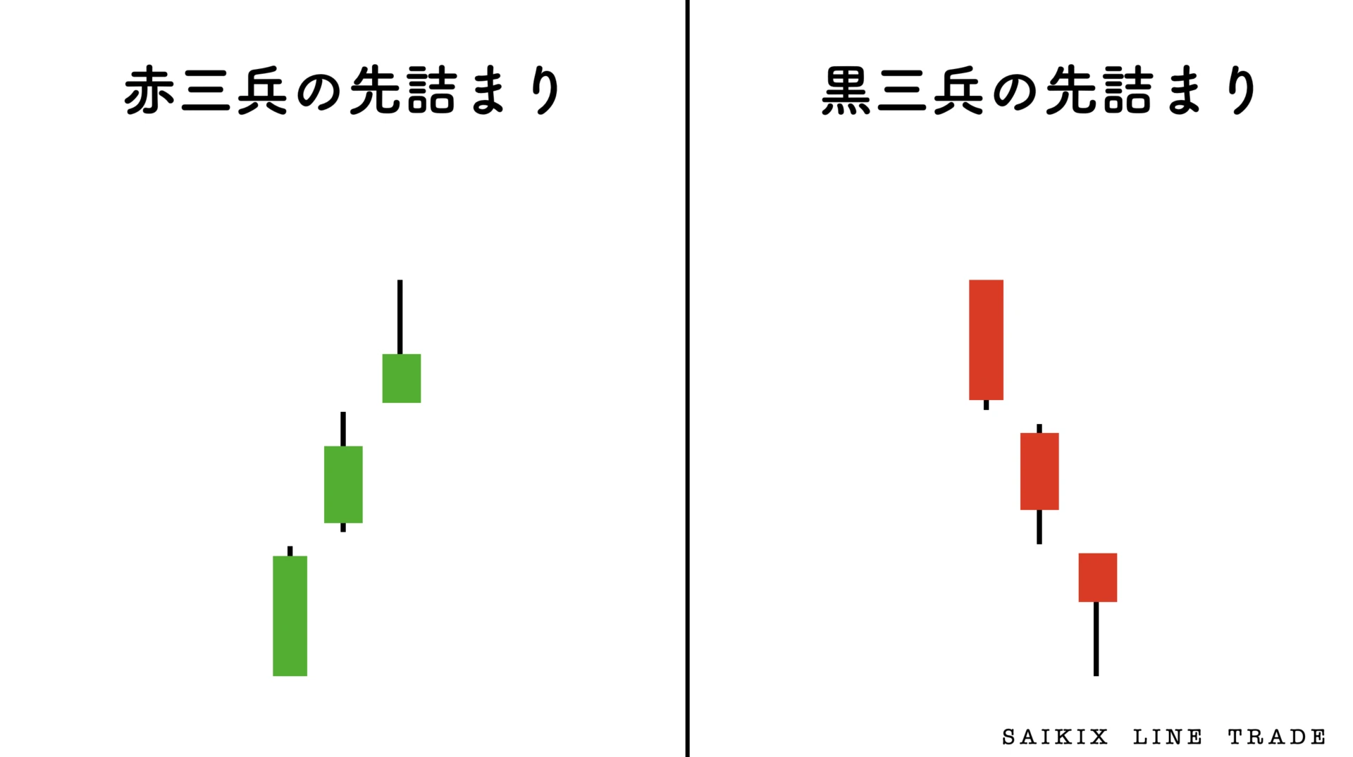 赤三平、黒三平は基本逆張りで使われることが多いローソク足パターンになり、逆張りに特化した赤三兵と黒三兵の亜種として「赤三兵の先詰まり」「黒三平の先詰まり」というローソク足パターンも存在します。