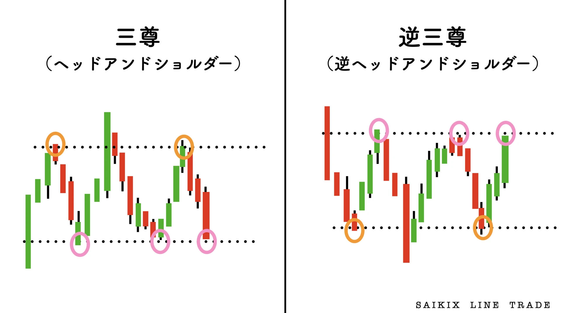 三尊とは...同じ価格帯で3回天井をつけているローソク足のパターンのこと、ヘッドアンドショルダーとも呼ばれる。