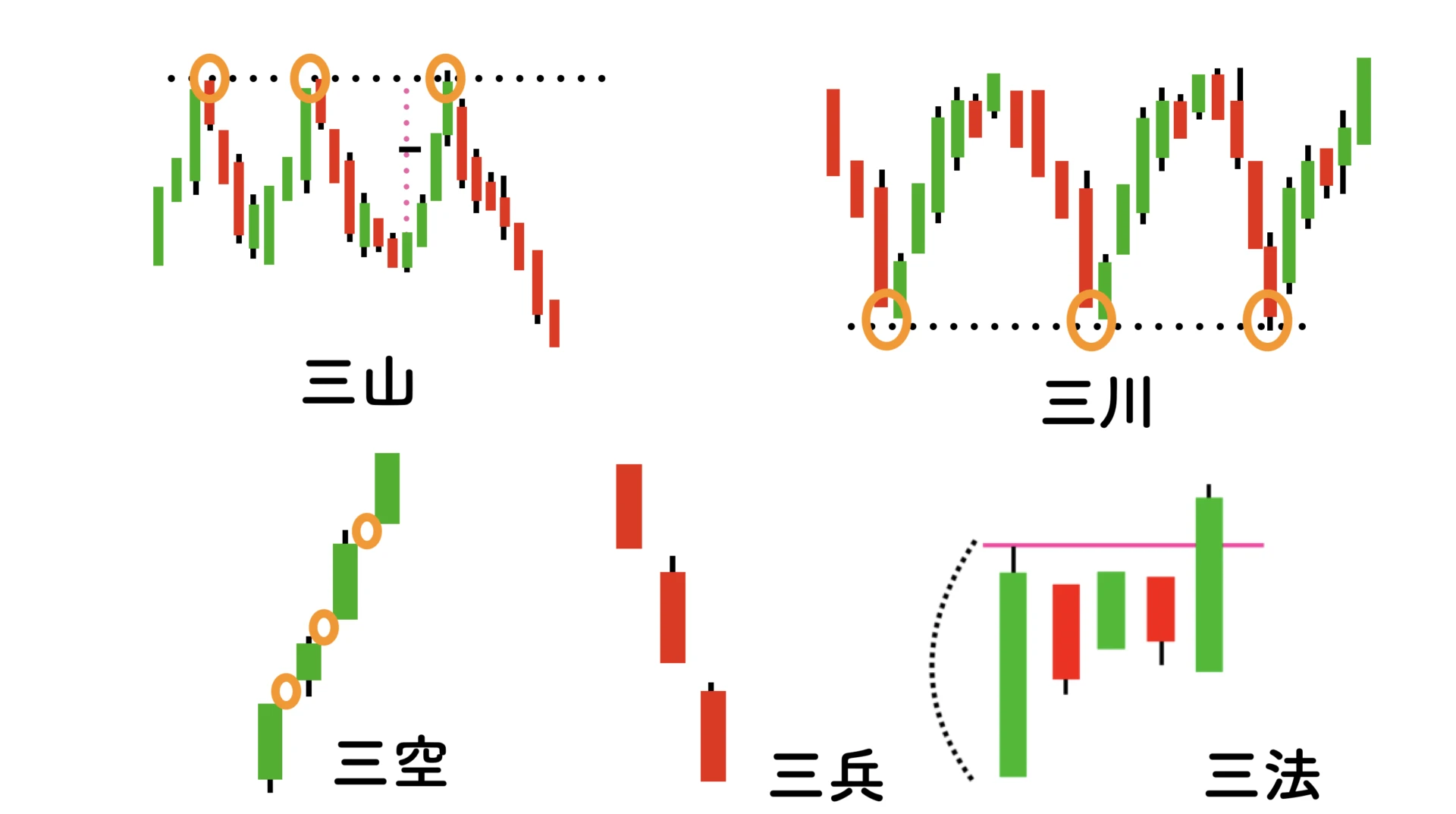 酒田五法では、三山は「3回も同じ抵抗線で反発したのだからここが天井であり、反転するだろう」との解釈で「三山=相場の反転サイン」「トレンド転換のサイン」として認識されています。
