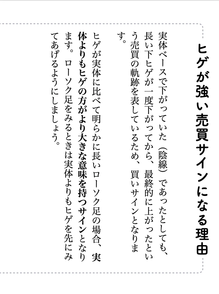 | ②ヒゲの長さ | ヒゲが長ければ長いほど、一度は上昇したのに下降した、一度は下降したのに上昇した、と短期間で戻されたことを表します。 |