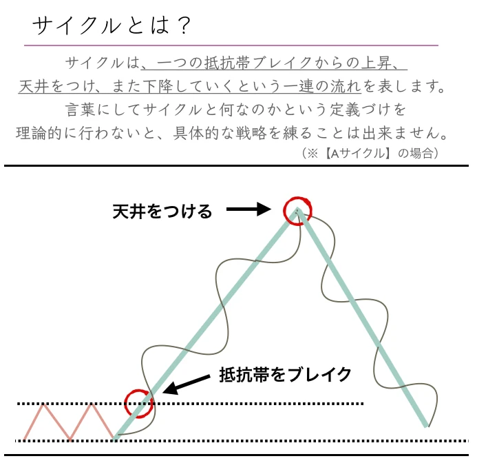 サイクルとは「相場の1つの抵抗帯ブレイクからの上昇、天井をつけてからの下降という一つのチャートの形」を指す言葉です。相場における「底→天井→底」の一連の流れであり、ローソク足でいうと9本〜30本程度の集まりとなります。
