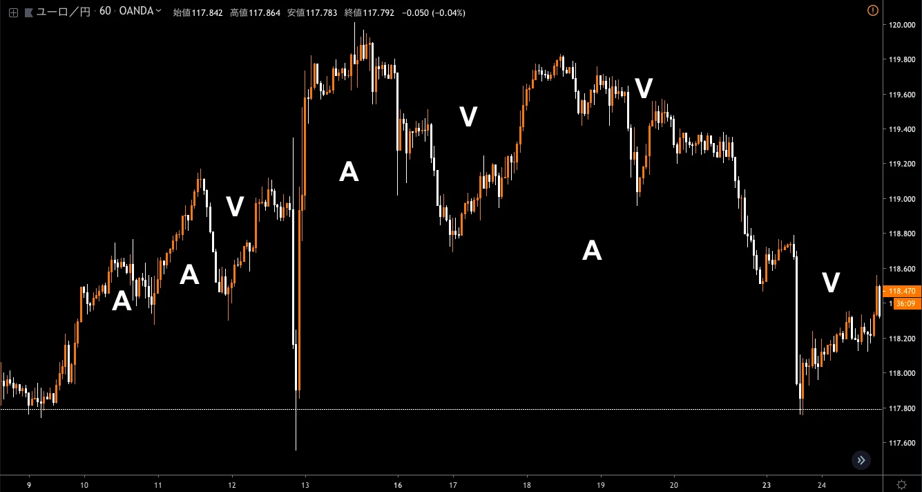 Aサイクルが多い場合には、上昇に対して必ず同じ分だけ下降している相場になるので、下降圧力が強いチャートということを表し、Vサイクルが多い場合には上昇圧力が強いことを表します。