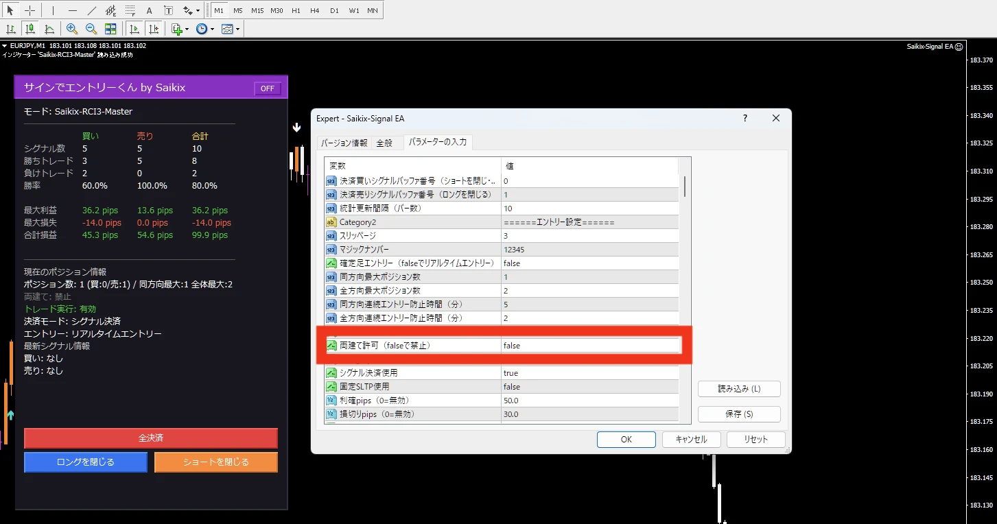 - 手動での決済ボタンの追加…EAのパネルをパネルに設置されたボタンを押すだけで手動で決済ができる機能を追加しました。「全決済ボタン」「買いロングを閉じるボタン」「ショートを閉じるボタン」の3つを用意しています。このボタンで閉じられるポジションというのはあくまでEAによってサインエントリーによってエントリーしたポジションのみとなり、手動でエントリーしたポジションはボタンを押しても決済されることはありません。