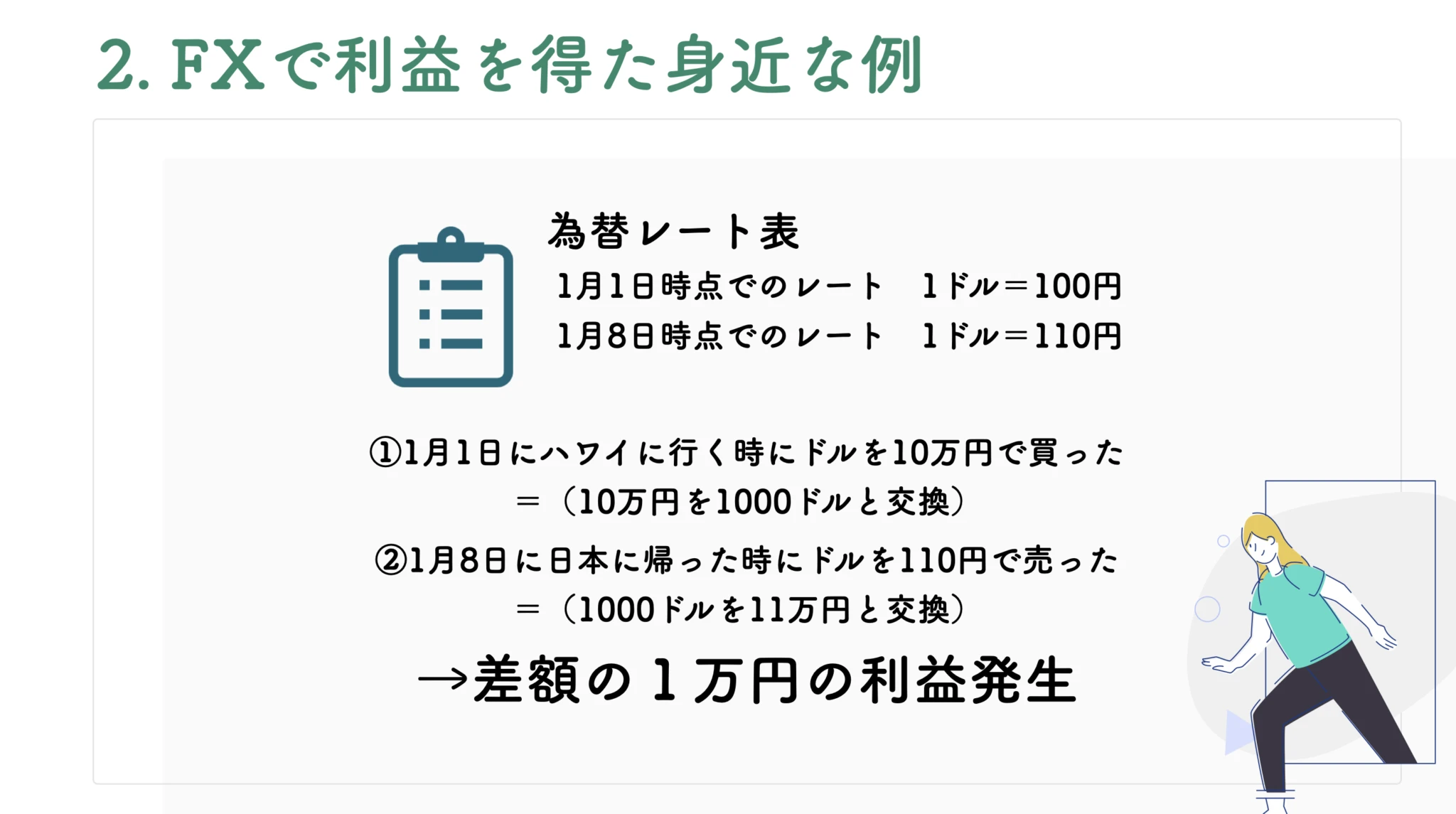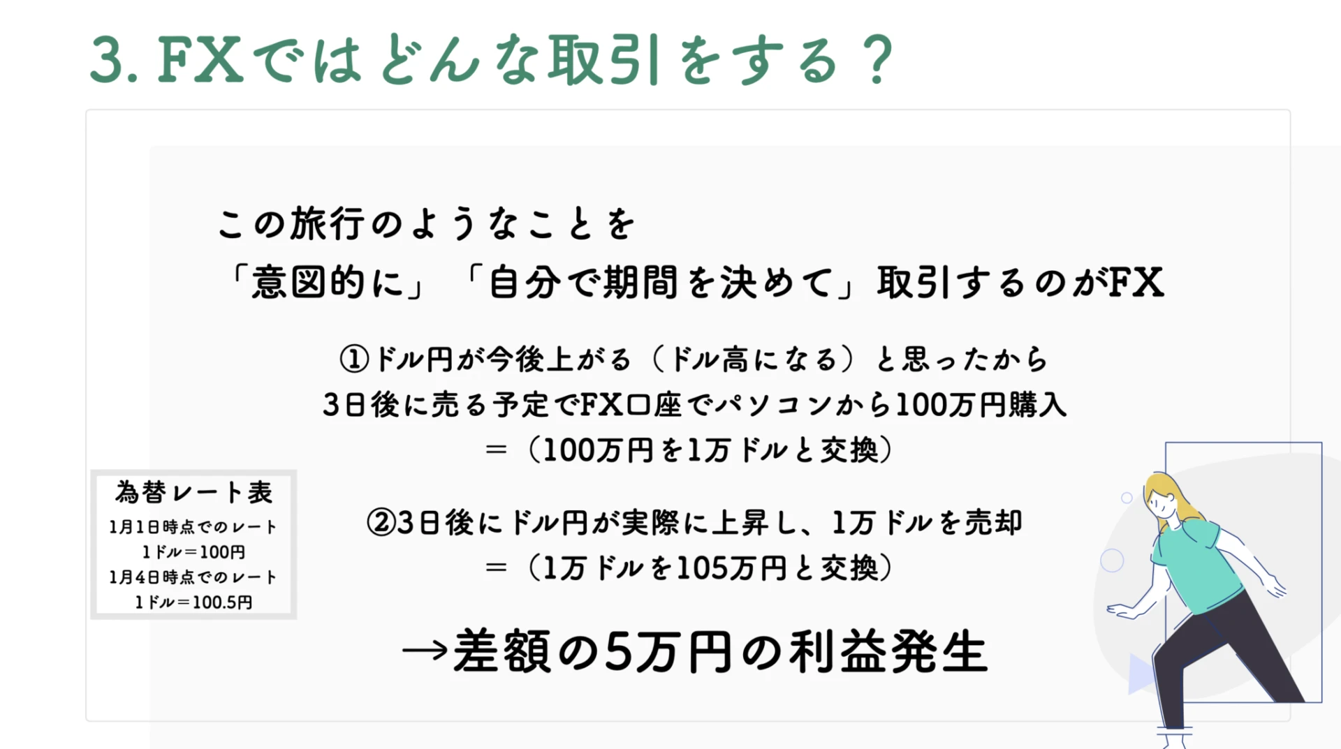 この記事では、今まで人生でFXという言葉を聞いたことがないというレベルの方でもわかるように、たくさんのイラストを使ってわかりやすく解説し「FXの基本のキ」を理解させます。