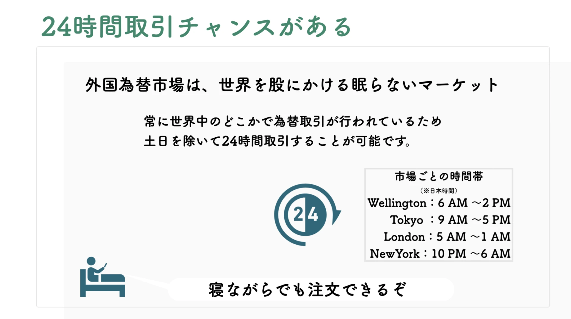 | 24時間取引可能 | 土日を除いて24時間取引することができる |